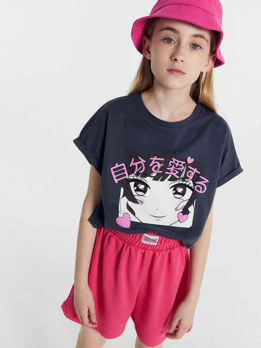 Футболка прямого силуэта для девочек с цельнокроеным рукавом. Нижние срезы рукавов с отворотами. Горловина круглой формы, обтачка из основного полотна. Шов притачивания обтачки закрыт бейкой из основного полотна. Низ изделия обработан на 2-х игольной плоскошовной машине швом в подгибку.
