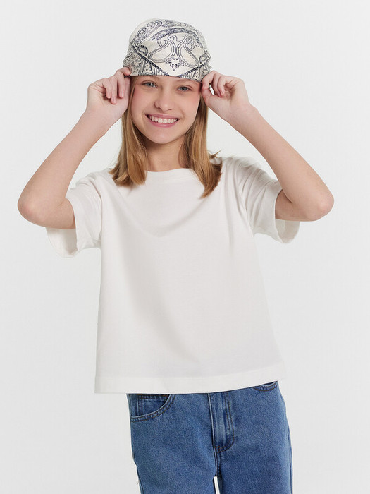 Футболка прямого силуэта. Перед и спинка цельнокроенные. Горловина круглой формы, широкая обтачка из рибаны. Рукав втачной, широкий. Футболка слегка укорочена. Подгибки низа и рукава широкие.