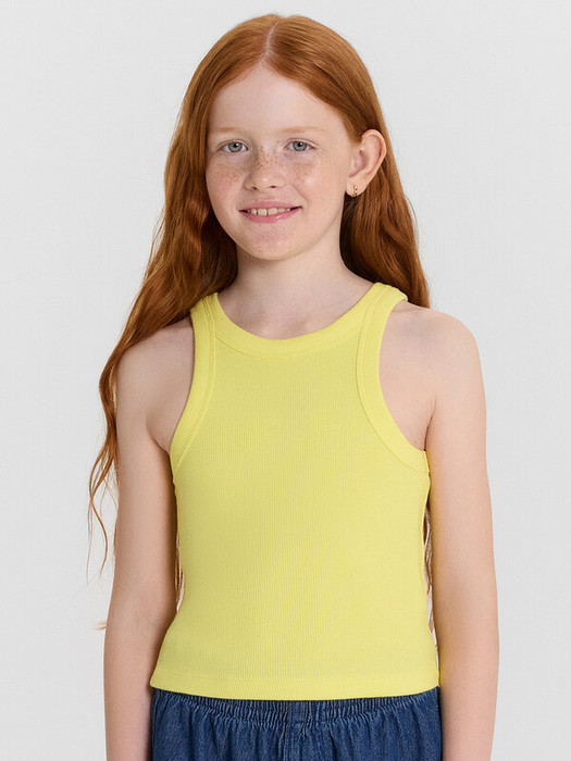 Топ для девочек из рибаны, облегающего силуэта, длиной ниже уровня талии. Перед и спинка цельнокроеные. Горловина круглая. Горловина и проймы окантованы широкой бейкой из основного полотна. Низ изделия обработан швом вподгибку.