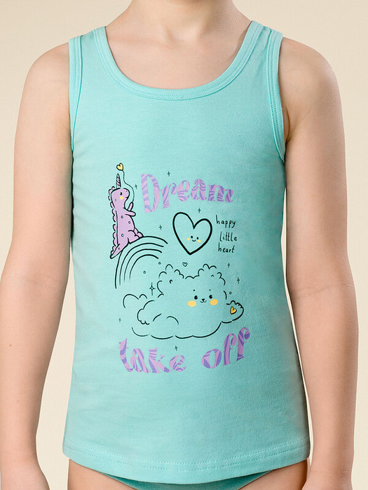 Каждая мама заботится о комфорте своего ребёнка и хочет выбрать для него только действительно качественное бельё. Наша красивая майка для девочки отлично подходит под эти запросы. Модель выполнена из ткани с высоким содержанием хлопка — она приятна на ощупь, великолепно пропускает воздух, позволяя коже ребёнка дышать. Эластан помогает изделию сохранять отличную форму в течение длительного времени. Качественная ткань и правильный крой гарантируют идеальную посадку— ребёнок чувствует себя комфортно целый день. Горловина и проймы обработаны эластичным пайпингом в тон — они не растягиваются и надолго сохраняют прекрасный внешний вид. Модель представлена в трендовых оттенках "персиковый бисквит" и "голубой топаз". Персиковый и голубой - очень нежные, по-настоящему девичьи цвета. Ваша дочка будет в восторге! Майка декорирована милым принтом с дракончиком-единорогом и позитивным текстом. Перевод: "Мечтай Взлезай, счастливое маленькое сердечко". Принт мягкий и устойчивый, отлично переносит стирки. Такая майка — идеа