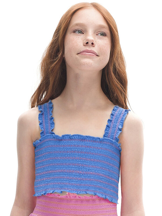 Кроп-топ из 100% хлопка для девочки. Ткань изделия дышащая и комфортная. По всей ширине модель украшена сборкой, которая выполнена эластичной нитью контрастного цвета — один из актуальных летних трендов. Кроп-топ лаконичного дизайна, поэтому его легко сочетать с различными шортами, юбками и леггинсами. С ним можно создать много разных образов. При этом он практически не займёт места в чемодане. Отличный выбор для летнего отдыха и путешествий.