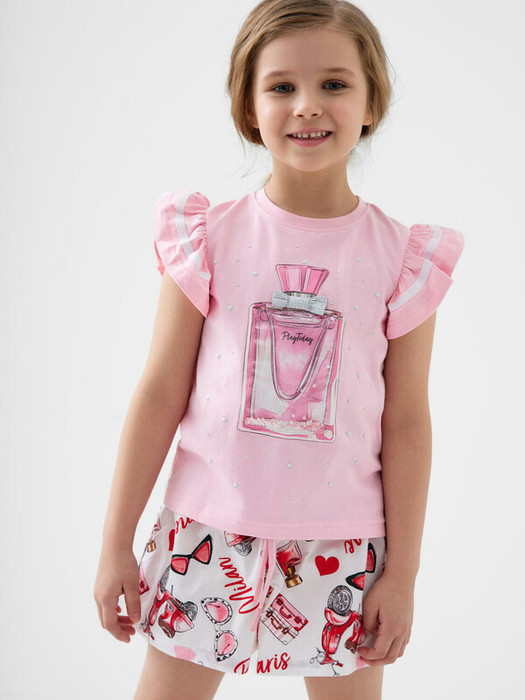 Детская футболка для девочки. Модель прямого кроя, выполнена из эластичного хлопкового трикотажа джерси. Спереди - крупный красочный принт. Горловина круглая. Рукава-крылышки.