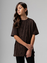 Футболка оверсайз для девочки подростка. Модель удлиненная, выполнена из меланжевого хлопкового трикотажа джерси. Красочный принт. Горловина круглая. В нижней части — небольшая нашивка.