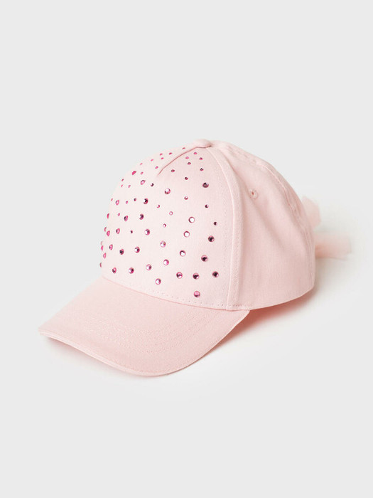 Бейсболка детская для девочки. Модель из светло-розового хлопкового текстиля. Классическая форма с изогнутым козырьком. Украшена прозрачными стразами спереди и аккуратным бантиком сзади. Бантик выполнен из сетки, а посадка обеспечивается мягкой эластичной лентой. Для вентиляции предусмотрены люверсы.