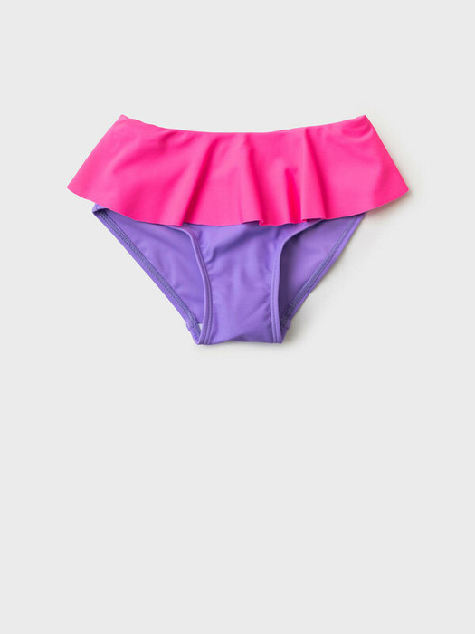 Купальные детские плавки для девочки. Модель с низкой посадкой, выполнена в сиреневом цвете с широким розовым воланом по талии. Для удобства в поясе вшита эластичная резинка, а вырезы для ножек обработаны мягкой латексной резинкой. Внутри предусмотрена ластовица с подкладкой. Благодаря UF-защите, ткань сохраняет первоначальный вид даже при длительном пребывании на солнце. Подходит для плавания и активного отдыха.