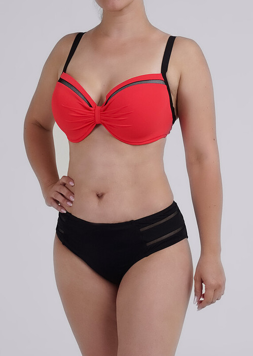 Костюм купальный женский из полиамида с эластаном. Лиф с классическими чашечками, с декоративными элементами спереди, в виде контрастных полос, на регулируемых бретелях. Трусы макси высокой посадки,так же с контрастными элементами.