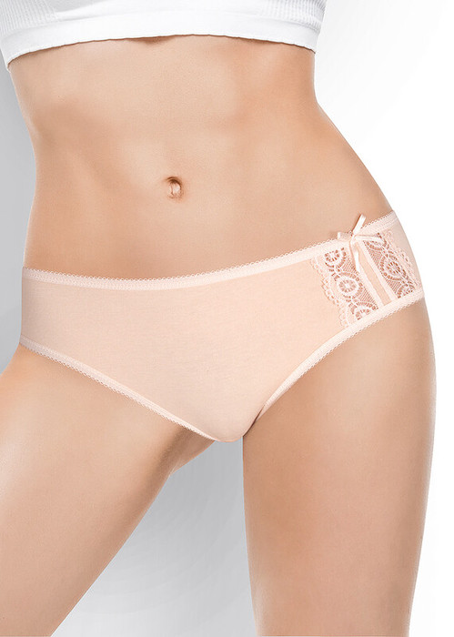 Трусы бикини женские из эластичного хлопкового полотна. Обработка краев - ажурная резинка с фестоном. Спереди отделка кружевом и бант.