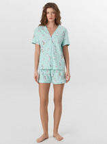 Пижама женская, изготовленная из хлопковой ткани, включает рубашку и брюки.