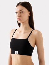 Бюстье женское из кулирной глади. Перед и спинка цельные. Перед на подкладке из кулирной глади. Срезы горловины переда, проймы и верхний срез спинки окантованы бейкой из основного полотна. Окантовка проймы переда переходит в бретель. На продолжении бретели из полотна стоит бретелечная тесьма с регулировкой по длине. Кольца-регуляторы.