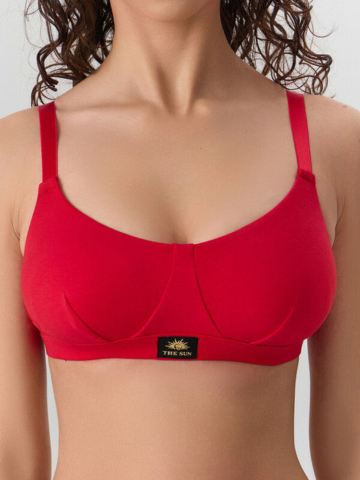 Бюстгальтер с мягкими чашками, без каркасов. Чашки выполнены из хлопка, на подкладке из хлопка. Чашки с вытачками. Чашки обтачаны подкладкой по линии декольте и пойме, внутри жилка. Ластовица выполнена из хлопка на подкладке из хлопка с монокапроном внутри. Отрезные бочки из хлопка на подкладке из хлопка. Верхний срез бочка обработан жесткой тесьмой, по размерам (внутренняя обработка, по лицевой стороне строчки нет). Нижний срез стана обработан обтачкой из хлопка с внутренней резиной. Бретель с регулировкой по размерам. Застежка двойная.
