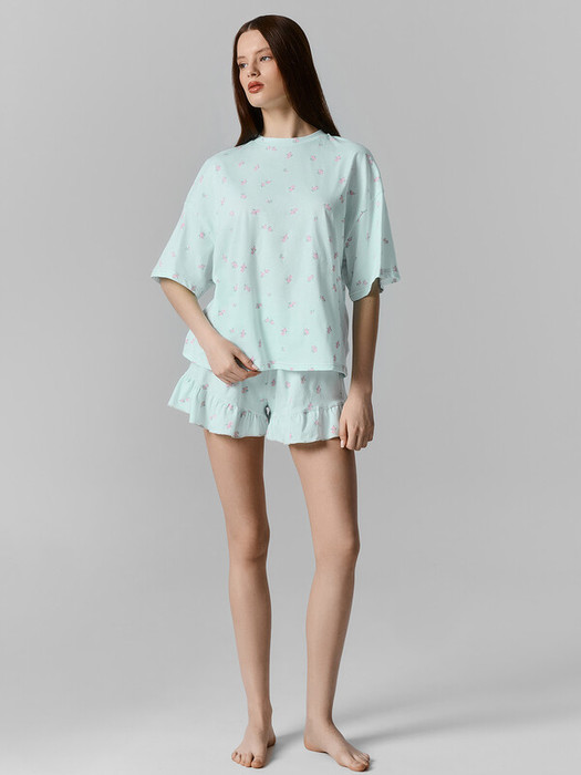 Комплект состоит из джемпера (592666) и шорт (592609). Джемпер прямой, свободный (оверсайз). Горловина круглая с обтачкой из основного полотна. Шов втачивания обтачки по спинке закрыт бейкой из основного полотна. Рукава втачные, короткие, широкие. Линия плеча спущена. Нижний срез джемпера и рукавов обработан швом вподгибку. Шорты свободного силуэта, укороченные, с посадкой на талии. Пояс цельнокроеный с эластчиной тесьмой внутри (внутр. 30мм 30RV). По низу шорт рюши, обработанные на микрооверлоке.