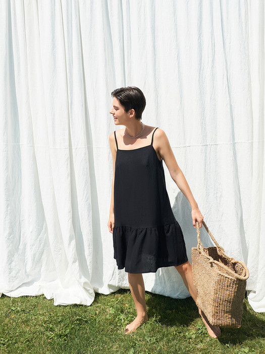Платье свободного силуэта. Срез переда и спинки обработан обтачкой. На бретелях из основного полотна. На бретелях кольца и регуляторы. На передней детали вытачки. По низу платья притачена рюша, низ рюши обработан в подгибку.
