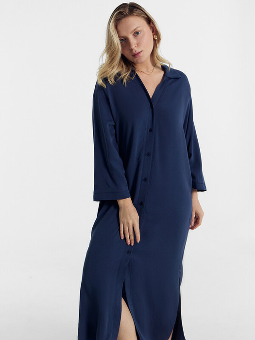 Платье женское домашнее прямого силуэта. Перед с центральной застежкой и отрезной планкой на пуговицах . Горловина V-образной формы, в горловину втачан воротник отложной. Рукав 7/8 укорочен, втачной. По низу рукава отрезная манжета. Нижний срез платья обработан швом вподгибку. Платье длиной ниже колена, в боковых швах обработаны разрезы.