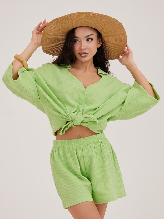 Домашний костюм из жатого муслина (100% хлопок) цвета нежных зеленых листочков состоит из рубашки и шорт. Рубашка на пуговицах, с V-образным вырезом и отложным воротником, с коротким рукавом и разрезами по бокам. По срезу рукава и низа - подгиб со строчкой. Широкие короткие шорты не резинке. Низ шорт с подгибом и строчкой.