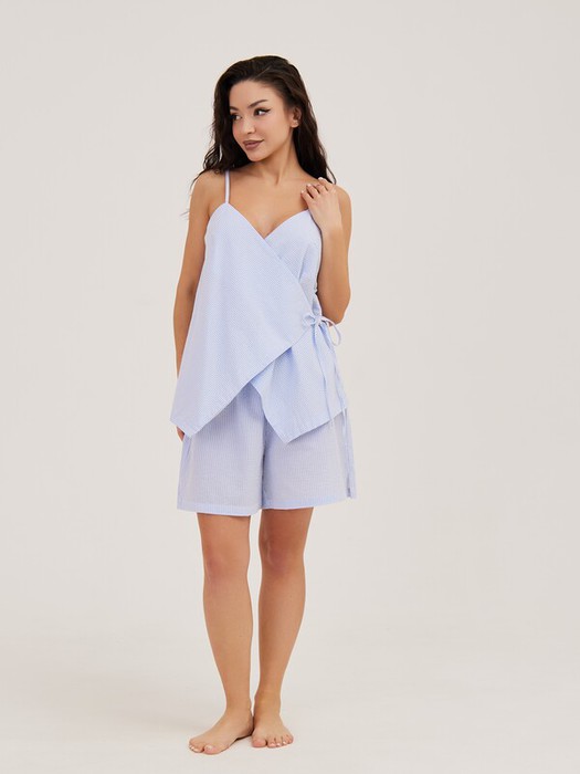 Пижама из жатого хлопка в бело-голубую полоску состоит из блузки и шорт. Блузка на тонких бретелях, полочки на запах с завязками по талии внутри и снаружи изделия. Свободные шорты с широкой резинкой.