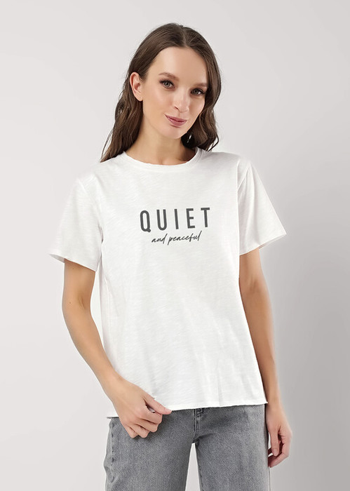 Футболка из трикотажного хлопкового полотна прямого кроя.Горловина с обтачкой с открытым срезом.Короткий втачной рукав.По низу изделия и рукава подгибка с открытым срезом. Спереди термопленка,термопайетки,принт с отлипом - в зависимости от цвета изделия.