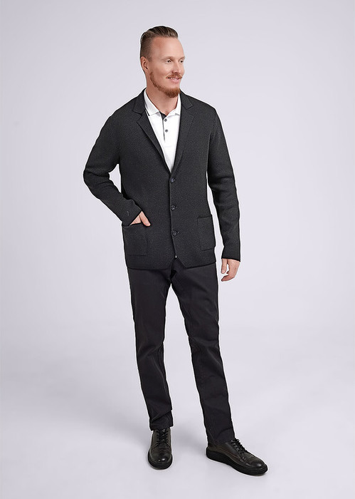 Пиджак вязаный мужской с втачным рукавом из смесовой пряжи. Изделие однобортное, с застежкой на пуговицы. Благодаря накладным карманам модель удобна в экспуатации. Пиджак можно носить с джинсами и брюками.