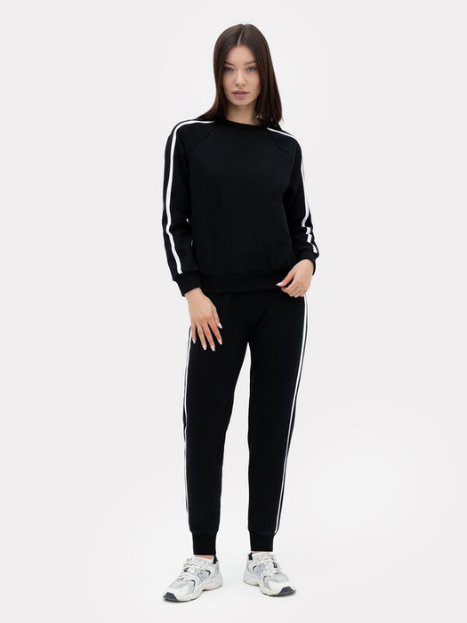 Спортивный комплект из футера без подчеса. В составе полотна – натуральный хлопок, немного полиэстера для прочности и эластана, который дарит свободу движений при нагрузках. Джемпер прямого силуэта, с длинными рукавами на манжетах, эластичным поясом на нижнем срезе и лампасами. Брюки зауженного к низу силуэта, на манжетаха, с лампасами и боковыми карманами. Широкий пояс из рибаны со шнурком-завязкой дарит особый комфорт во время занятий спортом и отдыха.