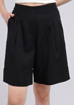 Шорты свободные, короткие из ткани. Посадка средняя. Пояс цельнокроеный с эластичной тесьмой внутри (внутр. 20мм 20RV). С внешней стороны пояса пробиты петли  и вставлен шнур-бейка из основного полотна. Нижние срезы шорт обработаны швом вподгибку с закрытым срезом.