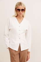 Женский жакет свободного кроя — сочетание комфорта и элегантности. Длинные рукава с широкими манжетами добавляют выразительности, а спущенное плечо создает расслабленный силуэт. Застежка на запах с завязками подчеркивает женственность, а V-образный вырез делает образ утонченным. Материалы — рами и лиоцелл — обеспечивают легкость, воздухопроницаемость и приятные тактильные ощущения. Они устойчивы к износу, хорошо держат форму и дарят комфорт в течение всего дня. Дополните этот жакет подходящими брюками из коллекции Mark Formelle, чтобы создать гармоничный и стильный комплект.