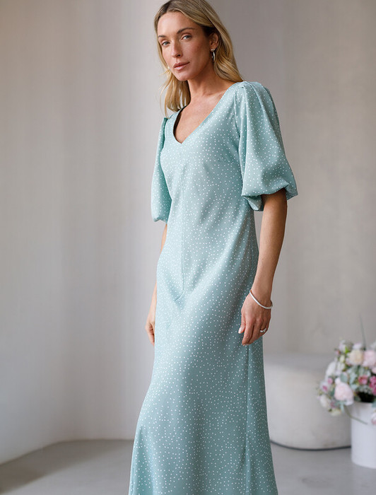 Платье А-силуэта кроеное по косой из струящегося полиэстера. Женственная модель с V-вырезом. Рукава выполнены на подкладке, которая позволяет им держать, заданную форму буфа даже во время движения. Высокотехнологичный, современный ПЭ легкий и гладкий - приятен к телу, как натуральный шелк, немного холодит и совершенно не мнется. Подойдет для торжественного выхода или повседневного образа.