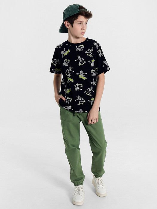 Брюки прямого силуэта. Посадка средняя. Пояс отрезной, внутрь застрочена  эластичная тесьма и шнур. По поясу две декоративные строчки. На передних деталях накладные карманы с наклонным входом. Ложный гульфик. По низу изделия внутрь застрочена эластичная тесьма.