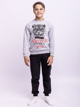 Джемпер с круглой горловиной и удлиненными рукавами на манжетах удобно сидит по фигуре, не сковывая движения. Низ изделия аккуратно подогнут для опрятного вида. Брюки с широким эластичным поясом мягко фиксируются на талии, а манжеты внизу не дают им задираться во время активных игр или отдыха.
