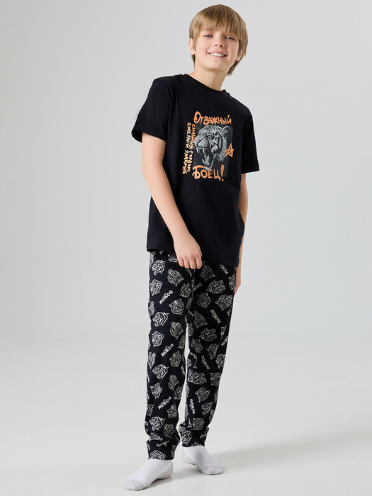 Стильная и уютная пижама для мальчиков. Выполнена из хлопковой трикотажной кулирки. Пижама состоит из футболки с коротким рукавом и длинных брюк с эластичной резиной в поясе. Штанины завершаются манжетами. Для самых комфортных снов!