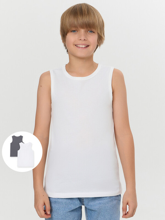 Набор из двух маек полуприлегающего силуэта из хлопковой трикотажной кулирки. Длина до середины бедер.  Горловина круглая, окантована мягкой бейкой. Нижний срез обработан плоским швом. Комфортная классика для вашего мальчика!