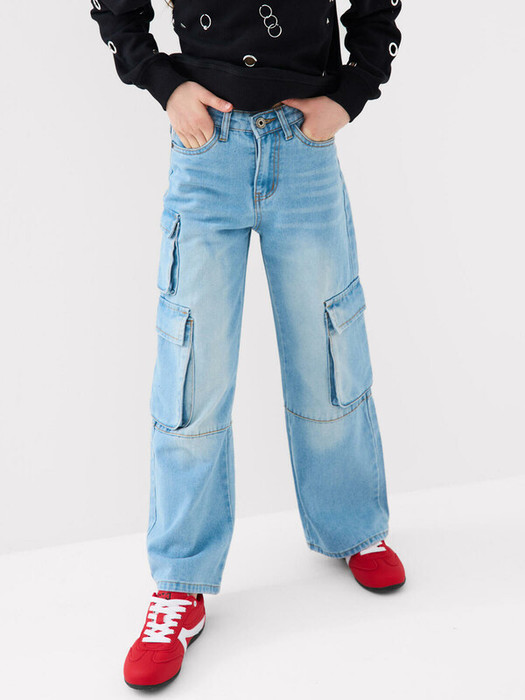 Джинсы карго для девочки подростка. Выполнены из классического синего денима и имеют прямой свободный крой. Джинсы застёгиваются на молнию и болт. Внутри пояса есть регулируемая резинка с пуговицей для удобства посадки. Благодаря большому количеству карманов — два спереди, два сзади и по два боковых — модель выглядит современно и функционально. Декоративные элементы варки придают джинсам модный винтажный вид.