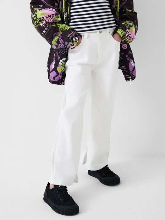 Прямые джинсы свободного кроя для девочки подростка. Модель выполнена из классического белого денима, имеет высокую посадку. Джинсы застёгиваются на молнию и болт. Пояс регулируется с помощью внутренней эластичной ленты и пуговиц, что позволяет подстроить изделие по фигуре. Спереди расположены два стандартных кармана и небольшой монетный кармашек, сзади — два накладных кармана. Брендированная этикетка на заднем кармане.