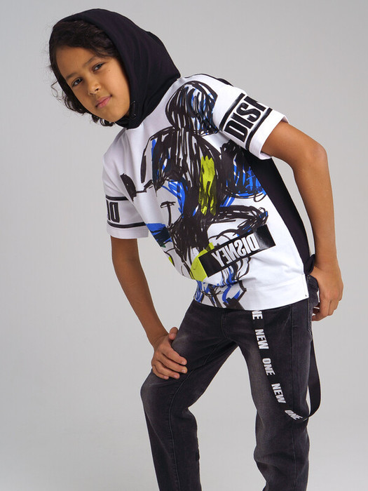 Футболка с капюшоном из качественного приятного на ощупь трикотажа с принтом Disney. Размер изделия на фото - 140, параметры модели (см): рост 145,5, обхват груди-талии-бедер: 67-62-71. Высокое содержание хлопка. Благодаря наличию эластана в составе ткани, изделие проще в уходе и держит форму.