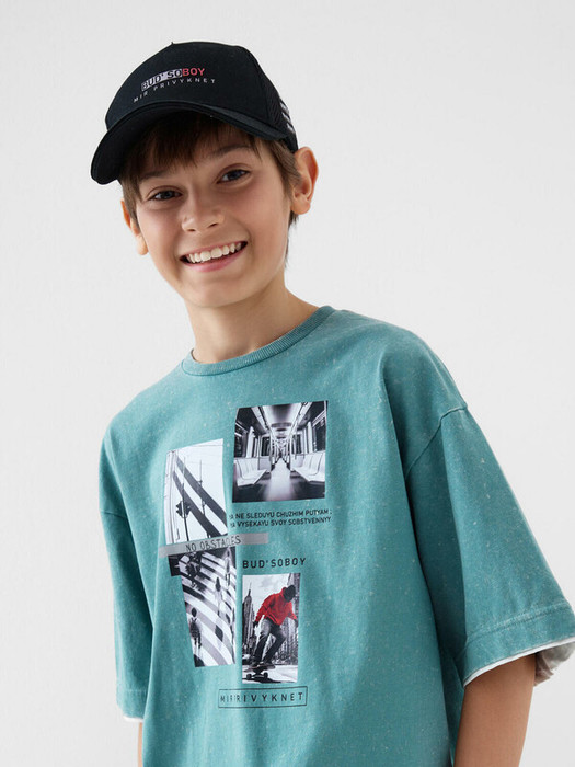 Бейсболка для мальчика подростка с изогнутым козырьком и сетчатой задней частью. Передняя часть выполнена из гладкой ткани, а задняя – из белой сетки, что обеспечивает хорошую вентиляцию. На фронтальной части размещен принт, сбоку — нашивка с надписью. Шеврон выполнен объемной печатью. Застежка сзади пластиковая на кнопки, регулируемая.