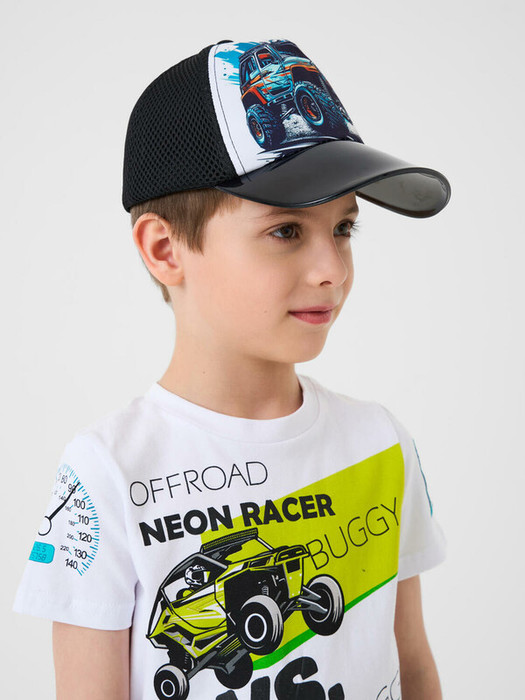 Детская бейсболка для мальчика. Она выполнена в классической форме с изогнутым козырьком. Передняя часть украшена ярким принтом. Задняя часть выполнена из сетки. Сзади — застёжка на липучке для регулировки размера.