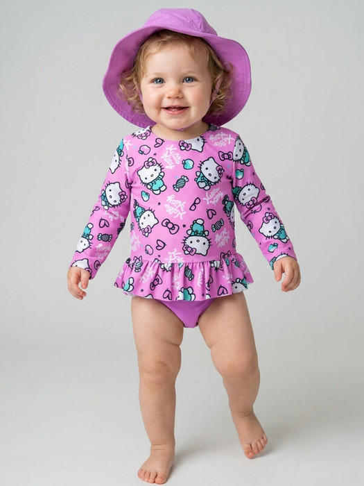 Комплект купальный детский для девочки: футболка с длинными рукавами, плавки и панама.  Лонгслив имеет свободный крой и украшен оборкой по низу. Яркий розовый фон дополнен весёлым принтом Hello Kitty. Панама выполнена в том же стиле и защищает голову от солнца, дополнена удобными завязками. Все края обработаны эластичной тесьмой, чтобы изделие хорошо сидело на теле и не натирало. Благодаря UF-защите, ткань сохраняет первоначальный вид даже при длительном пребывании на солнце. Он идеально подходит для пляжа или бассейна.
