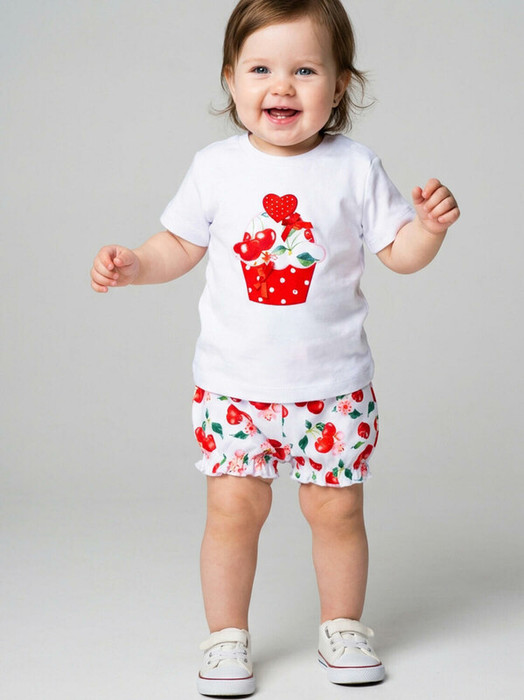 Детский костюм для девочки. Состоит из футболки с коротким рукавом и шорт. Выполнен из хлопкового трикотажа. Футболка прямого кроя, с красочным принтом и декоративными бантами. Застежка на кнопки на плече для удобного переодевания. Шорты свободные, хорошо сидят на талии благодаря эластичному поясу. По низу эластичные резинки.