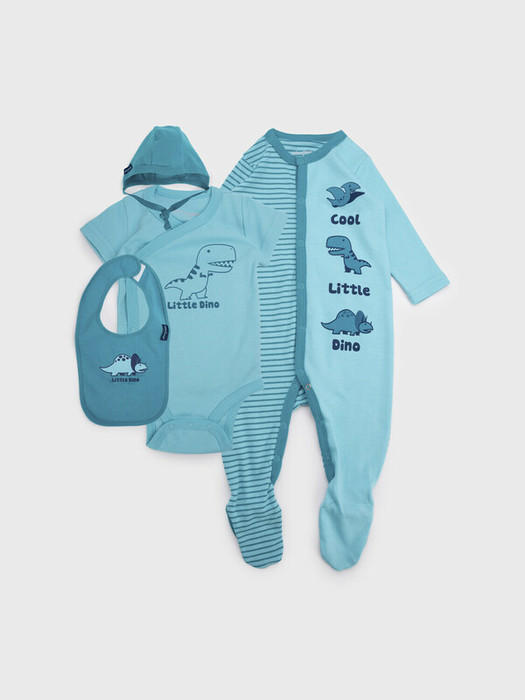 Комплект для новорожденного: комбинезон, боди, чепчик, нагрудник. Комбинезон с застежкой на кнопки. На пятке легкая фиксация на тонкую резинку. Боди имеет застежку на кнопки. Чепчик из трикотажа с завязками. Нагрудник из трикотажа с застежкой на липучку.