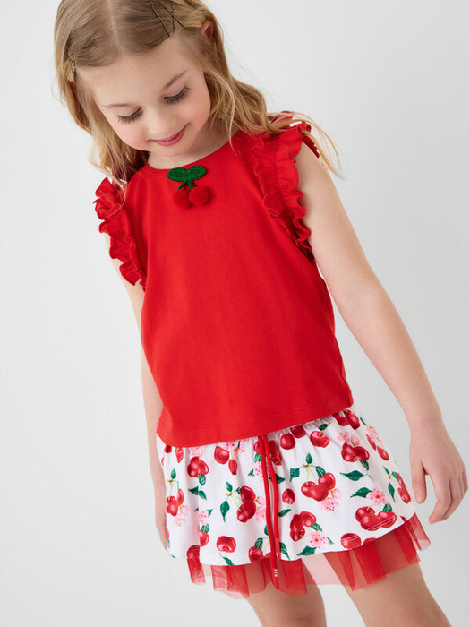 Детский трикотажный комплект для девочки. Состоит из футболки и юбки-шорт. Футболка прямого силуэта. На рукавах расположены декоративные рюши, а на передней части размещён объёмный декор в виде вишен. Юбка-шорты имеют удобную посадку на талии за счёт эластичного пояса и шнурка. Верхняя часть украшена ярким принтом с вишнями и цветами, а внутри расположены трикотажные шорты. Дополнительный объём и декоративный эффект создаёт сетчатый подъюбник.