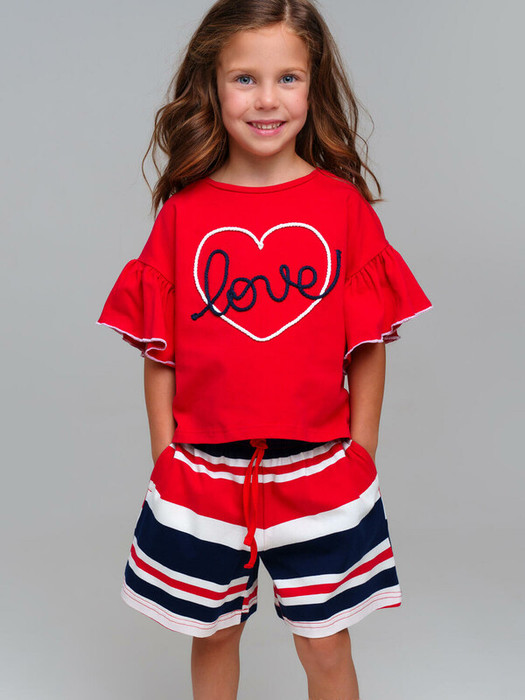 Костюм детский для девочки. Комплект оверсайз: футболка, шорты с высоким содержанием хлопка 95%. Благодаря наличию эластана в составе ткани изделие проще в уходе и держит форму. Шорты на резинке со шнурком. Боковые карманы. Модель выполнена из качественного и приятного на ощупь трикотажа.