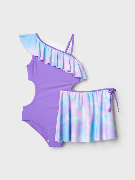 Комплект для девочки подростка из купальника и юбки. Купальник выполнен в сиреневом цвете с необычным асимметричным кроем: одно плечо открыто, второе украшено широкой плиссированной оборкой с ярким акварельным принтом. По бокам — фигурные вырезы. В комплект входит отдельная плиссированная юбка с тем же принтом и декоративным бантом на поясе. Изделие выполнено из эластичного материала и дополнено мягкой подкладкой. Подходит для пляжа и бассейна.