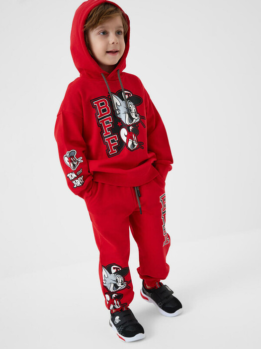 Детский спортивный костюм для мальчика. Комплект выполнен из хлопкового футера и состоит из худи и джогеров на резинке. Толстовка свободного кроя с красочным принтом. Манжеты и пояс выполнены из эластичного риба, благодаря чему изделие хорошо держит форму. Брюки джоггеры — комфортные, с эластичным поясом и шнуром для регулировки посадки. Низ штанин собран на резинку.