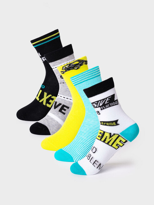 Набор из пяти пар детских носков для мальчика. В комплект входят модели с полосками, однотонные и с изображением машин. Удобная резинка не сдавливает ногу, а на стопе — аккуратная жаккардовая надпись с размером. Материал — мягкий хлопковый трикотаж.