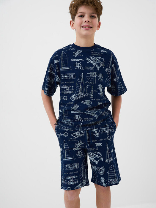 Пижама для мальчика подростка. Комплект состоит из оверсайз футболки с коротким рукавом и шорт. Изделие выполнено из мягкого, хлопкового трикотажа и имеет свободный крой, который обеспечивает комфорт. Принт на ткани — в морской тематике: яхты, схемы. Горловина футболки круглая с эластичной окантовкой, на шортах — удобный пояс с резинкой и завязками, а также карманы в боковых швах.