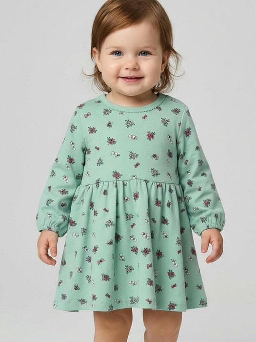 Детское платье для девочки. Выполнено из мягкого хлопкового трикотажа джерси. Модель свободного кроя, длиной до колена, с длинными рукавами на резинке. Платье с лёгкой сборкой на юбке. На плече — удобная застёжка на кнопки для лёгкого надевания.