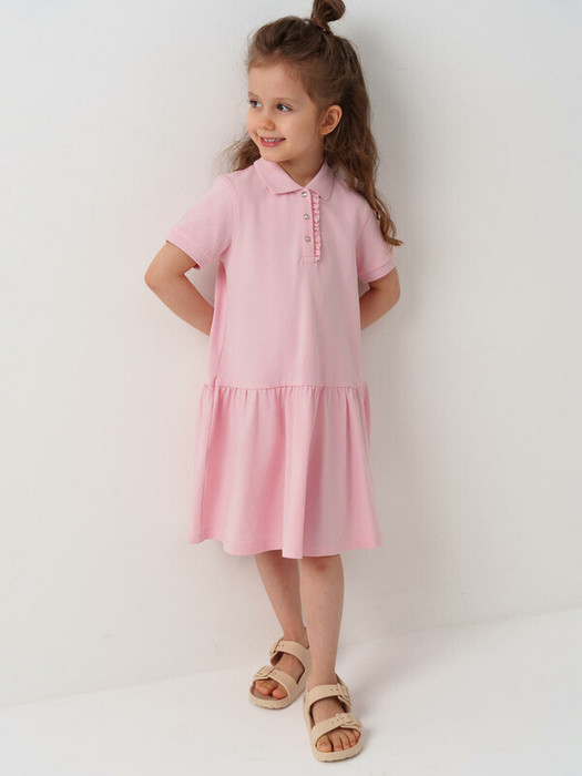Летнее детское платье-поло для девочки. Выполнено из мягкого хлопкового трикотажа пике. Короткие рукава, классический воротник поло и застежка на кнопки спереди. По низу — присборенная юбка, создающая нежный силуэт.