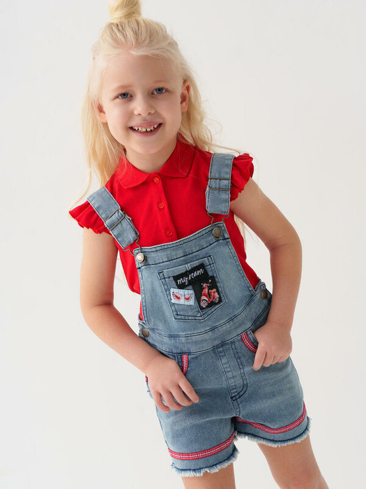 Детский джинсовый полукомбинезон для девочки. Удобная регулировка пояса с внутренней стороны — при помощи резинки и пуговиц. Застегивается на кнопки по бокам. Лямки регулируются по длине за счёт металлических пряжек. Функциональные элементы включают нагрудный, задние накладные карманы и передние карманы. Комбинезон украшен нашивками и декоративным бантиком.