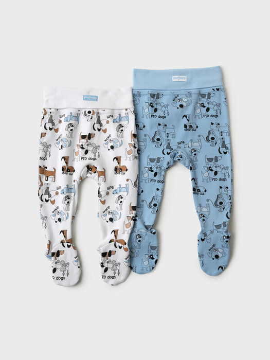 Комплект из двух мягких ползунков для новорожденного мальчика. Обе модели с закрытыми ножками и удобным широким поясом на резинке. Один из вариантов украшен ярким принтом с весёлыми собачками на белом фоне, второй — выполнен в голубом цвете с тем же принтом. На поясе спереди есть декоративная нашивка с логотипом. Материал — приятный к телу, 100 % хлопковой трикотаж интерлок.