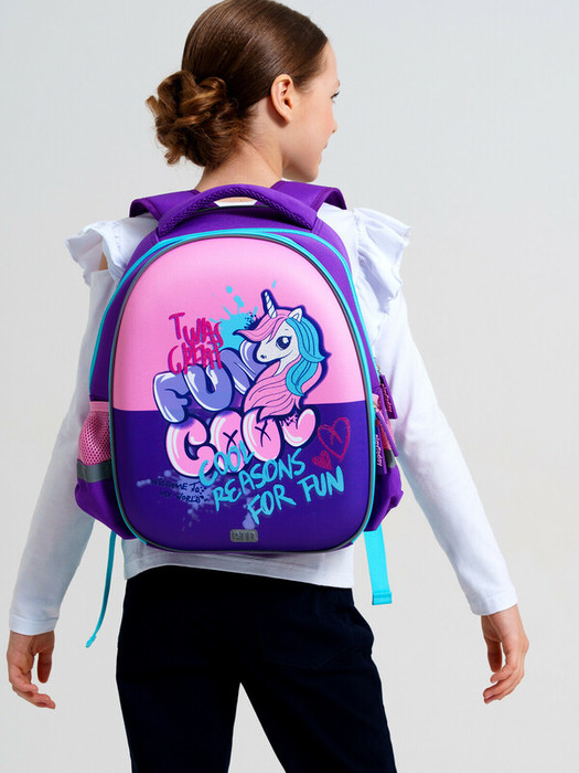 Школьный рюкзак для девочки подростка. Формованный ранец с ортопедической вентилируемой спинкой, распределяющей равномерно нагрузку на спину ребенка. Широкие вентилируемые лямки, регулируемые  под рост и одежду ребенка, ранец отлично держит форму, не деформируется при складывании в него школьных принадлежностей, устойчивое дно с пластиковой накладкой. Влагозащитная пропитка, светоотражающие элементы на лямках, карманах и передней понели, а так же по периметру задней и передней панелях. Основное отделение на молнии, дополнительный отсек на молнии, два боковых кармана, внешний карман на молнии. В основном отделении большой внутренний карман с тремя отсеками для папок и тетрадей с эластичной лентой липучка, в дополнительном отсеке карманы и отсеки для канцелярских принадлежностей. Рюкзак в школу можно дополнить мешком для обуви и пеналом в том же дизайне.