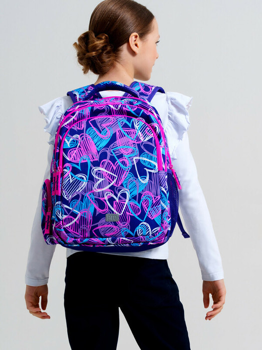 Школьный рюкзак для девочки подростка. Прямые широкие регулируемые лямки с мягкими вкладками и сетчатым покрытием для улучшения вентиляции, 3 основных отделения на молнии, 2 боковых  кармана: сетчатый и на молнии. Внутри: 1 отсек: карман на молнии, открытые карманы для канцелярии. 2 отсек: без карманов, 3 отсек: карман для папок, карман на молнии, 2 кармана без замка, карабин для крепления пропуска/пенала/ключей, усиленная спинка, дно и верхняя ручка, спинка и обратная часть плечевых ремней - сетчатые, для улучшенной вентиляции, светоотражающие элементы на переднем кармане и плечевых ремнях