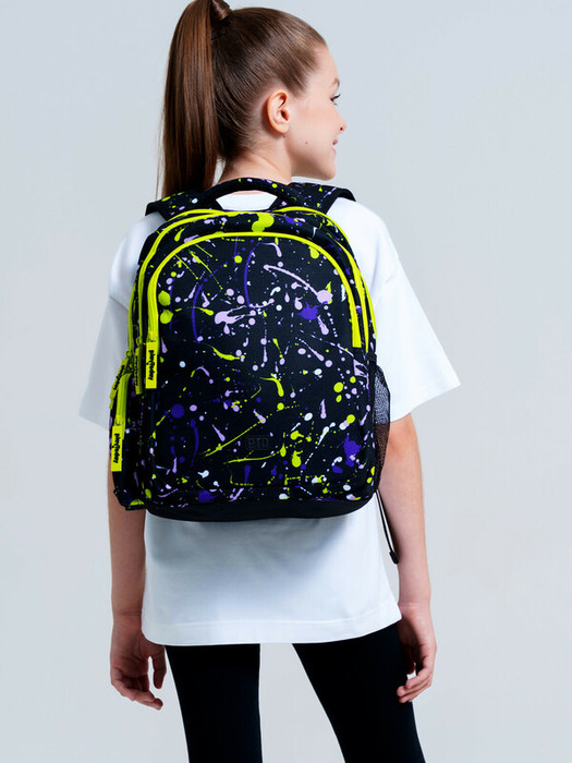 Школьный рюкзак для девочки подростка. Прямые широкие регулируемые лямки с мягкими вкладками и сетчатым покрытием для улучшения вентиляции, 3 основных отделения на молнии, 2 боковых  кармана: сетчатый и на молнии. Внутри: 1 отсек: карман на молнии, открытые карманы для канцелярии. 2 отсек: без карманов, 3 отсек: карман для папок, карман на молнии, 2 кармана без замка, карабин для крепления пропуска/пенала/ключей, усиленная спинка, дно и верхняя ручка, спинка и обратная часть плечевых ремней - сетчатые, для улучшенной вентиляции, светоотражающие элементы на переднем кармане и плечевых ремнях. Рюкзак в школу можно дополнить мешком для обуви и пеналом в том же дизайне.